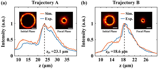 Figure 3 shows the peak intensity profiles of the ring in the AAFV beams along propagation. Considering the scaling factor of the relay optical system, the initial diameters of the AAFV beams in the focal plane of the microscope objective were 15.6 μm and 10.4 μm, and the theoretical axial focal positions [
