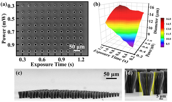 Figure 4b shows the evolution of the inner opening diameter of the polymer as the power and exposure time changed. As the exposure dose increased, the inner opening diameter of the fabricated microstructures increased rapidly from the initial 7.5 μm. Until the laser power was higher than 0.8 mW and the exposure time was longer than 0.9 s, the diameter gradually stabilized and approached 16 μm, indicating that the exposure dose tended to saturate. The exposure dose in the upper left region of