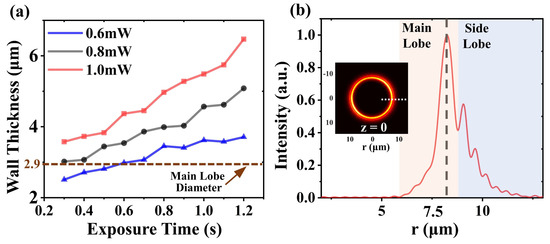 Figure 5a. The wall thickness exhibited a significant thickening trend with the increase of the exposure time (exposure dose). Compared to the theoretically calculated main-lobe diameter (brown dotted line in