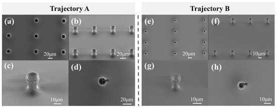 Figure 6a–h, respectively. Furthermore, the fabrication of the micro-traps with other opening diameters only required dynamically switching the phase mask loaded on the SLM. The measured inner opening diameters of these two types of micro-trap were 15.8 μm and 9.3 μm, respectively.