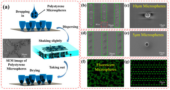 Figure 7f,g) obtained by the confocal microscope (Olympus FV1000/IX81, Shinjuku Monolith, 3-1 Nishi-Shinjuku 2-chome, Shinjuku-ku, Tokyo 163-0914, Japan, inverted), the microspheres with a diameter of 10 μm emitted green fluorescence with a maximum wavelength of 518 nm under the excitation of a 473 nm laser. Initially, the fluorescent microspheres were randomly scattered in the Petri dishes (