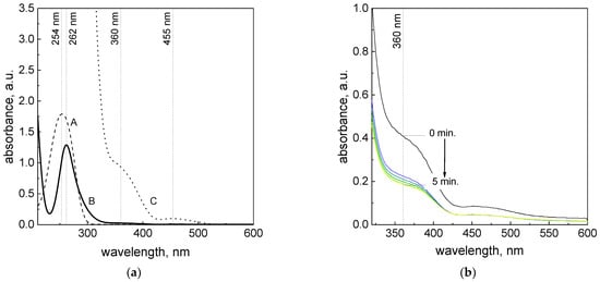Spectrophotometric studies have shown that both L-ascorbic acid and the platinum(IV) chloride complex have characteristic spectra. For L-ascorbic acid in an aqueous solution at low concentration values (2 × 10−4 M), the characteristic maximum absorbance appears at the wavelength of λmax = 254 nm (Figure 1a, A), whereas for the Pt(IV) ions at concentrations of 10−4 M, the peak is localized at 262 nm (Figure 1a, B). It is worth noting that the appearance of the peak at 262 nm is not limited to the [PtCl6]2− form. Murray et al. [22] studied the Pt(IV) ion spectra and reported that species like [PtCl5H2O]− and [PtCl6]2− have analogical spectra, with the minima and maxima located at 230 and 262 nm, respectively. The difference between them are in the molar coefficient values, and for [PtCl5H2O]−;, they are equal to ε230 nm = 12,500 M−1cm−1 and ε262 nm = 11,600 M−1cm−1, whereas for [PtCl6]2−, they are equal to ε230 nm = 3300 M−1cm−1 and ε262 nm = 24,500 M−1cm−1 [22]. At higher Pt(IV) ion concentrations, the maxima of both species are located at a similar wavelength, i.e., 353 nm, and have the same value of the molar coefficient (ε353 nm = 490 M−1cm−1); they are difficult to separate.