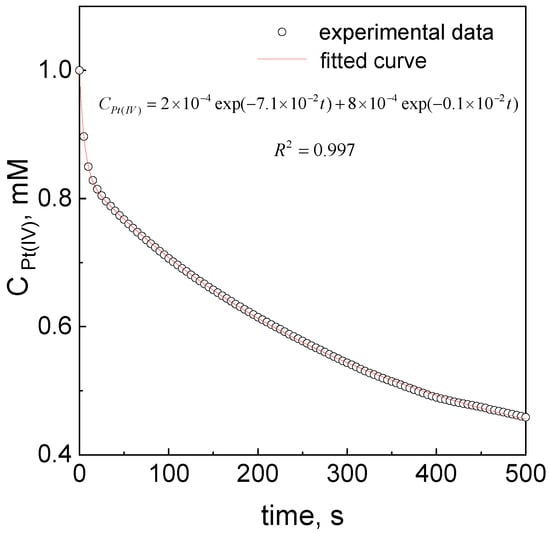 Based on the obtained experimental spectra evolution (Figure 1b), the kinetic curves, i.e., the absorbance change in time, were registered. Taking into account the fact that the change in the absorbance value at 360 nm is very fast at the beginning, we decided to register the kinetic curves using stopped-flow techniques. This spectrophotometer allows for a fast solution heating and protects the solutions from oxygen from the air (the system is closed compared to standard spectrophotometer equipped with exchange cuvette), and also allows for fast reagent mixing as well as analysis. Next, the values of absorbance were recalculated according to the Lambert–Beer law (A ) and drawn as a function of time. The sample of the kinetic curve, illustrating the decrease in the platinum concentration over time at 360 nm and fitting the equation to the experimental data, is shown in Figure 2.