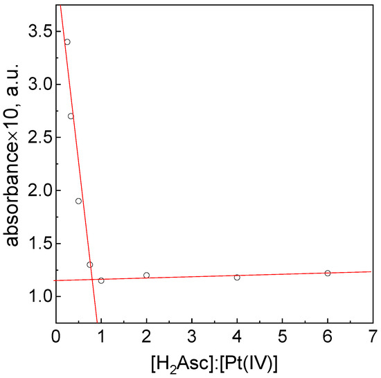 To determine the stoichiometry, the reagents were mixed at different molar ratios. The collapse of the graph showing the absorbance as a function of the molar concentration ratio C0,H2Asc:C0,Pt(IV) appeared at the ratio of 1:1 (Figure 3). This is in good agreement with the findings of Lemma et al. [7]. It seems that the stoichiometry of the reduction reaction between Pt(IV) and L-ascorbic acid does not change in the presence of oxygen dissolved in the solution. However, it is interesting that the value of the absorbance has not reached zero.