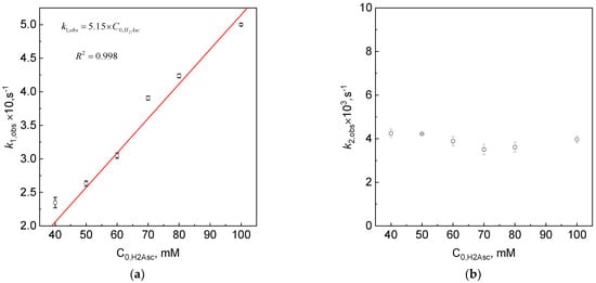 The value of the second-order rate k1 has the value of the directional coefficient from the fit to the relationship k1,obs =f(C0,H2Asc), and it equals 5.15 M−1s−1. In the case of the second observed rate constant (k2,obs), there is no such linear dependency (Figure 4b). The value of the observed rate is constant. This suggests that the process is independent of the initial concentration of ascorbic acid.