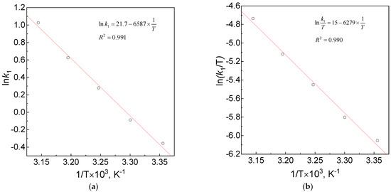 The obtained dependencies are linear. Knowing the equations of the straight lines, the relevant parameters were determined in both equations. The values of these parameters, i.e., EA and A in the Arrhenius and values ΔH≠ and ΔS≠ in the Eyring equation, are given in Table 3 and Table 4.