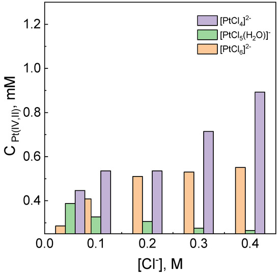 The obtained results indicate that with an increase in the chloride ions, an increase in the amount of [PtCl6]2− ions can be expected, because the addition of chloride ions reverses hydrolysis process (2). Thus, the amount of [PtCl5(H2O)]− ions in the solution decreases. The obtained values of [PtCl4]2− ([Cl−] = 0.0 M, see Supplementary Materials, Table S1) are interesting since they exceed the value of the initial concentration of Pt(IV), i.e., 0.1 mM. This can be explained by the presence of Pt(0) and is described in detail in Section 3.11. Also, chloride ions are reactants in reactions (6) and (8), and might lead to the formation of (7) and ions (8).