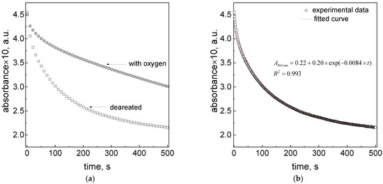 As expected, the kinetic curves differ depending on the conditions (see Figure 7a). The change in the character of the kinetic curves suggests that one of the processes was eliminated (see Figure 7b) or the overall process accelerates in the deaerated solution (see comparison of fitting curve for both experimental conditions with oxygen and in deaerated solution fitted using the same fitting equation, shown in Supplementary Materials, Figure S5).
