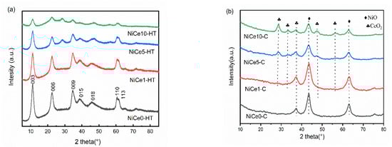XRD patterns of the hydrotalcite-like precursors NiCex-HT (a) and the mixed oxides NiCex-C (b).