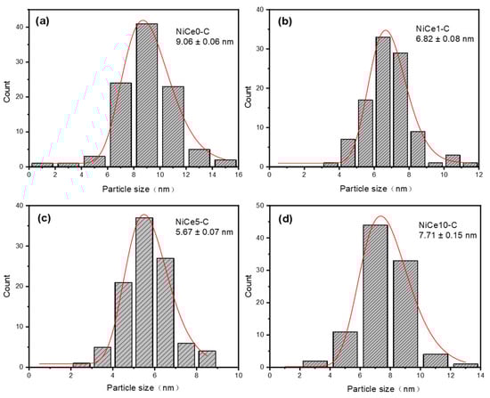 The particle-size frequency distribution and the average particle size were obtained by calculating the particle size of about 100 particles in the TEM image and plotting the frequency distribution histogram. As displayed in Figure 5, average particle size is in the range of 5–10 nm. The small size of the Ni nanoparticles is probably due to the confinement effect of the HT precursor [47], which processed that the ordered metal oxides grids would confine the growth of the Ni particles and achieve the highly dispersed Ni particles [48,49]. Meanwhile, the corresponding average particle size was found to follow the order: NiCe5-C (5.67 nm) < NiCe1-C (6.82 nm) < NiCe10-C (7.71 nm) < NiCe0-C (9.06 nm). Optimal Ce element loading (5 wt.%) led to the lowest Ni particle size. In a word, the statistics and TEM images proved that the aggregation of Ni particles in the NiCe0-C catalyst could be halted to some extent by the incorporation of the Ce element, which would play a positive effect on the uniform dispersion of the Ni nanoparticles.