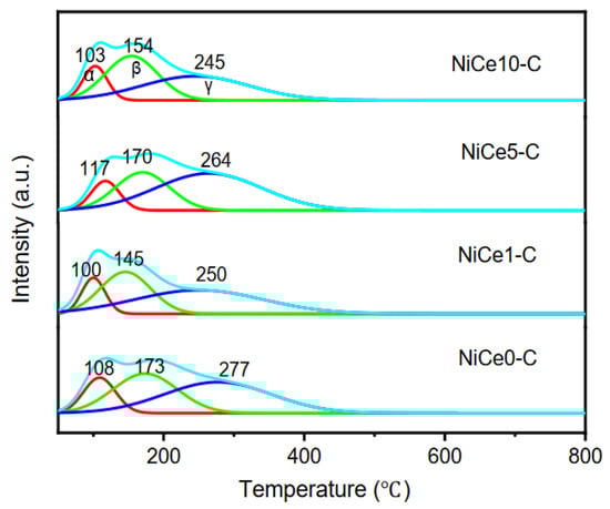 In the CO2 methanation process, the reaction molecule CO2 was not directly absorbed on metal nickel, but on surface basic sites (OH− groups or alkali/alkaline-earth metal oxides), which was beneficial to activate CO2 [21,55,56]. Hence, CO2-TPD was carried out for the NiCex-C catalysts to determine the basic strength and CO2 adsorption capacity. As shown in Figure 7, the desorption curves of all the samples could be divided into three types of Gaussian peaks (α, β, γ peaks). The three reduction peaks occurred at 100~120, 140~170, and 250~280 °C, respectively [7,11], which correspond to weak-strength basic sites (α and β peaks) and medium-strength basic sites (γ peak). The weak-strength basic sites were attributed to the rapid formation of bicarbonate, which was due to the weak adsorption of CO2 by the hydroxyl group on the catalyst surface [14], while the medium basic sites were assigned to Lewis basic sites (acid-base Ce4+-O2− and metal-O2− pairs) associated with CO2 adsorption. These basic sites bound CO2 sufficiently strong for its activation and subsequent reduction [57]. Based on the literature [58], the medium basic sites played an important role in the CO2 methanation process. From the previous report, the surface charge would be disturbed by introducing hetero-ions into the hydrotalcite layer [59]. Thus, the incorporation of the Ce element into the nickel-based hydrotalcite obviously influenced the distribution of basic sites. Detailed information of the surface basic sites’ relative content for all reduced NiCex-C samples was displayed in Table 2. The proportion of the medium basic sites were calculated and were found to follow the order: NiCe5-C > NiCe1-C > NiCe0-C > NiCe10-C. The quantities of CO2 adsorbed on basic sites over reduced NiCex-C catalysts were summarized in Table 3. The highest density of medium-strength basic sites was found on the NiCe5-C sample (0.79 mmol CO2/gcat), suggesting that CO2 could be more easily activated and further affect the catalytic performance. The incorporation of 10 wt.% of the Ce element could lead to a slight decrease in total basicity (0.80 mmol CO2/gcat). The NiCe10-C exhibited the lowest CO2 adsorption capacity, and thus, the least amount of CO2 for the methanation. The correlation between the surface basic sites and its catalytic activity in the CO2 methanation will be further explored in subsequent sections [60].