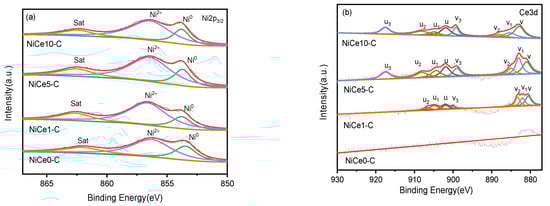 XPS spectrum of Ni 2p3/2 (a) and Ce3d (b) of the NiCex-C catalysts. In (a) the green line indicates the Ni0 species, the purple line indicates the Ni2+ species, the brown line indicates satellite peaks, and the red line is the original curve.