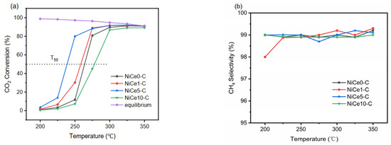 CO2 conversion (a,b) CH4 selectivity of NiCex-C catalysts with a temperature range from 200 to 350 °C, GHSV = 15,000 mL/gcat/h H2/CO2 = 4 (molar ratio), 50 mL/min, 200 mg catalyst.
