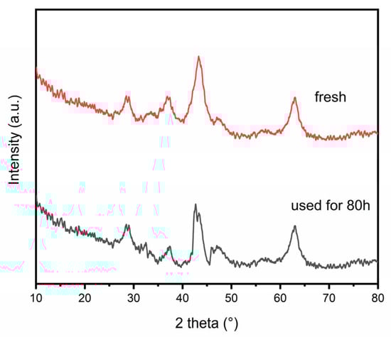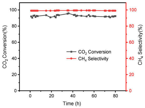 The long-term stability of the catalyst was of great importance for industrial application. Catalysts are prone to sintering under high-temperature conditions, which can lead to catalyst deactivation [3]. Therefore, the stability of the catalyst was judged by testing the CO2 conversion and CH4 selectivity at higher reaction temperatures (300 °C) and whether there were significant changes under prolonged operation as indicators. After 80 h of the stability test, as shown in Figure 10, the NiCe5-C catalyst also exhibited high activity, with about 91.7% of CO2 conversion and almost 100% of CH4 selectivity. In addition, there was no obvious deviation for them under the 80-h stability test. It indicated that the well-dispersed nickel particles on the catalyst surface (TEM results) could enhance the anti-sintering ability of the NiCe5-C sample and avoid deactivation after long-term use. The XRD spectra of the NiCe5-C catalyst after the 80-h stability test was shown in Figure 11. The crystalline phase remained essentially the same compared with that of the fresh NiCe5-C catalyst, which proves the stability of the catalyst structure after this reaction.