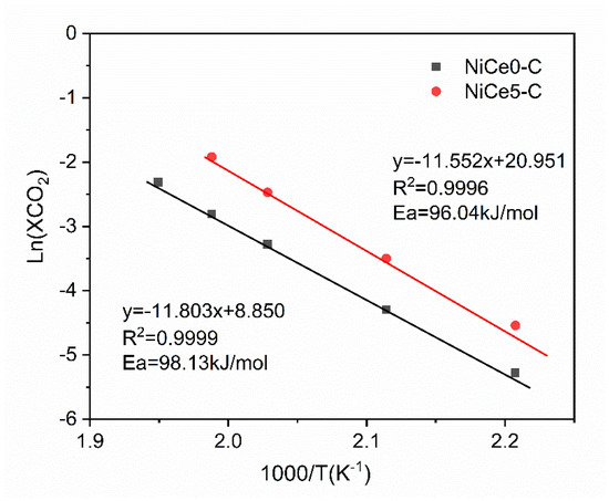 Hydrogenation of CO2 to methane was a first order reaction, and the reaction of H with CO2 was the rate-controlling step for this reaction [74]. The apparent activation energies of the samples were measured by the Arrhenius equation. As shown in Figure 12, the logarithm of CO2 conversion as x variable and the reciprocal of temperature as y variable fit a straight line. The apparent activation energies of the catalysts were obtained by calculating the slope of the fitting lines. Compared to the NiCe0-C catalyst (98.13 kJ/mol), the apparent activation energy of the NiCe5-C catalyst was lower (96.04 kJ/mol). This result suggested that the CO2 methanation reaction was more facile on the NiCe5-C catalyst. It was contributed to the remarkable promotion effect of cerium on promoting charge transfer from active metal to the CO2 molecules [73]. Therefore, the reactant CO2 molecules were more easily activated, which is in favor of decreasing the energy barrier of the H and CO2 reaction.