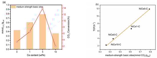 On the basis of previous literature reports, the Lewis acid-base sites instead of strong basic sites were involved in the CO2 methanation mechanism [75,76]. Therefore, it was necessary to explore the relationship between catalytic activity and the number of medium basic sites. As plotted in Figure 13a, the highest CO2 conversion at 225 °C was achieved over the NiCe5-C with the strongest medium-strength basic sites. In addition, the CO2 conversion of the catalysts was positively correlated with the number of medium basic sites. In this contribution, we observed the turnover frequency of the catalysts almost displayed linear relationship with the content of medium-strength basic sites at 225 °C (Figure 13b). It showed that the TOF values increased with increasing amounts of medium-strength basic sites. These results demonstrate that the variation of Ce content could effectively regulate the number of medium-strength basic sites on the surface of NiCex-C, and the medium-strength basic sites on the catalyst played a crucial role in achieving high catalytic activity for CO2 methanation at low temperatures.