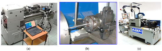 View of test stands for rolling external threads, equipped with angular heads according to the first (a) and second (b) and third (c) kinematic variations.