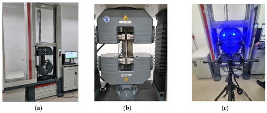 Zwick Roell Z400E testing machine: (a) general view; (b) view of the traverses with a sample; (c) view of the ARAMIS device for optical measurement of the sample deformation.