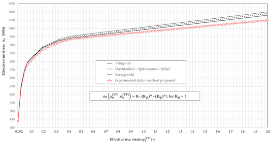 The effective true stress–effective true strain curves developed from the proposed semi-empirical method (Experimental data) and from the Bridgman, Davidenkov–Spiridonova and Siebel, and Szczepiński methods for non-linear strain hardening material models, for C45 steel.