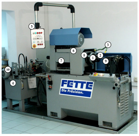 View of the FETTE rolling mill for axial threading: 1—head, 2—workpiece, 3—cooling and lubricating system, 4—hydraulic feeder, 5—control system, 6—fixed headstock, 7—headstock shift control system, 8—control system for closing and opening the head, 9—hydraulic holder, 10—rolling mill motor.