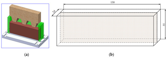 View of the sample with a square mesh (a) and view of the sample with a deformed mesh after shaping the trapezoidal outline (b).