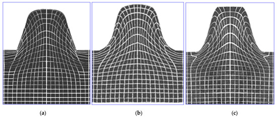 View of exemplary finite element meshes after shaping a trapezoidal thread for the friction coefficient : (a) after model investigation, (b) after numerical simulation according to the first methodology, (c) after numerical simulation according to the second methodology.