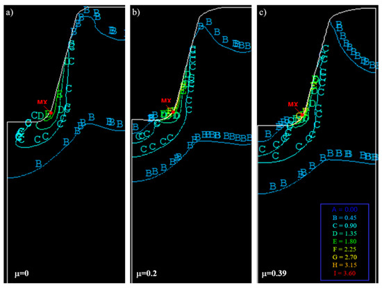 Maps of effective stress for different values of the friction coefficient after a trapezoidal thread rolling, MPa. (a) µ = 0; (b) µ = 0.2; (c) µ = 0.39.