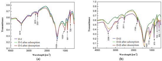 2.5. Analysis of Changes in the Structural Properties of Dolomites after the Process of Adsorption and Desorption
