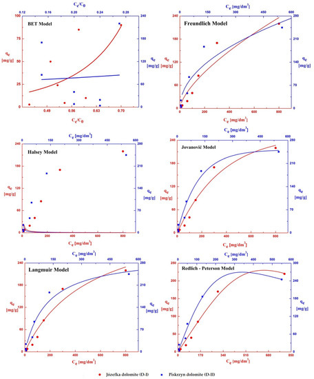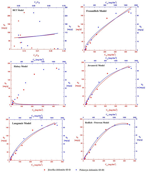 | Brunauer, Emmet, Teller (BET) | Co—the initial concentration of the substance in the solution [mg/dm3]. Ce—the concentration of the adsorbate in the solution at equilibrium [mg/dm3]. qe—the equilibrium concentration of the adsorbate on the adsorbent surface [mg/g]. qmax—maximum adsorption capacity [mg/g]. KBET—BET adsorption equilibrium constant. KF—Freundlich adsorption equilibrium constant [dm3/mg]. KL—Langmuir adsorption equilibrium constant [dm3/mg ]. KJ—Jovanovich adsorption equilibrium constant [dm3/mg ]. KH—Halsey adsorption equilibrium constant [dm3/mg ]. n—adsorption intensity. aRP, B—Redlich–Peterson constant [dm3/mg]. KRP—Redlich–Peterson adsorption equilibrium constant [dm3/mg]. | |
