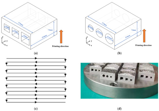 Although the use of support structures can improve part performance, it has drawbacks such as time and material wastage, difficulty in removing support from small holes, and secondary damage during removal [24]. Therefore, this work aims to print the inner structure without any support structures. To further study the inner structure fabrication via SLM, this work compares the two most representative types of inner structures, cylindrical- and parallelepipedic-shaped holes, and provided a different forming mechanism to address the previous gap in understanding the formation of inner structures.