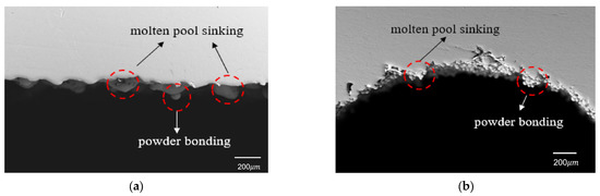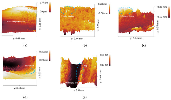From the SEM images in Figure 3, it can be observed that the sinking distance of the overhanging surface of the parallelepipedic-shaped inner hole was mainly caused by the lack of support on the bottom layer, which was loose powder instead of solidified metal. The large gap in the heat conductivity rate between the solidified metal and loose powder led to a longer solidification time for the molten pool on the overhanging surface, resulting in a longer sinking distance. The capillary force between the molten pool and the powder in the hole increased the weight of the molten pool, further aggravating the sinking distance. The sinking molten pool morphology and powder accumulation in the center provided evidence for this explanation.
