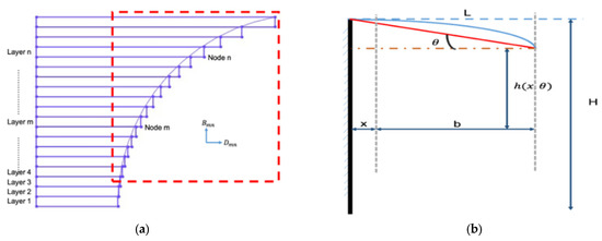 The surface is challenging to characterize mathematically; thus, it is simplified by connecting the front and end of the actual machining plane and defining the angle with the horizontal direction as θ, which is related to the properties of the molten pool. When the molten pool is too heavy and the sinking phenomenon is severe, θ increases, and the whole overhanging surface drops sharply. Here, x represents the total length of the n-1 layer, b represents the length of the n-th layer, and h(x,θ) represents the actual overhanging height. Solving for h(x,θ) reveals the displacement of the overhanging surface in the horizontal or vertical direction, which is closely related to the thickness of the material, the sinking angle of the overhanging surface, and the distance of the processed layer.