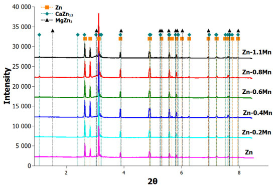 The synchrotron X-ray diffraction patterns provided confirmation of the presence of the mentioned phases in the alloy. The Zn matrix phase (ICDD: 00-004-0831 [23]) exhibited a hexagonal structure with the space group P63/mmc. Similarly, the MgZn2 phase (ICDD: 00-077-1177 [24]) also displayed a hexagonal structure with the same space group. The CaZn13 phase (ICDD: 00-028-0258 [25]) demonstrated a cubic structure with the space group Fm3c, as depicted in Figure 3. These structural characterizations contribute to our understanding of the alloy’s crystallographic properties and aid in further analysis of its behavior and performance.