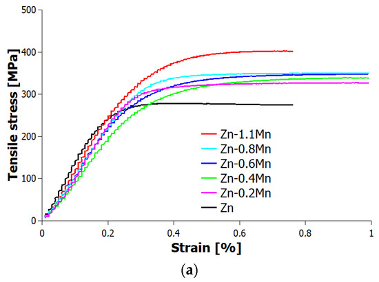 Tensile, compressive, and three-point bending tests, as well as measurements of elastic moduli and microhardness, were performed in order to evaluate the influence of adding manganese to the Zn-Mg-Ca alloys. Based on the performed tests, it was confirmed that there is a direct correlation between the content of manganese and the maximum stresses in both tension and compression. As the Mn content increased, the maximum stresses observed during both tensile and compressive testing also increased. This indicates that the addition of Mn increases mechanical strength of the Zn-Mg-Ca alloys, resulting in higher stress tolerance in both tension and compression (Table 2). Among the tested alloys, the Zn-0.4Mg-0.4Ca-1.1Mn alloy exhibited the highest strength in tension having a UTS (ultimate tensile strength) of 379 MPa (Table 2) and a YS (yield strength) of 299 MPa, which are considerably higher values compared the pure Zn, UTS and YS of 30 MPa and 23 MPa, respectively [15]. However, the Zn-0.4Mg-0.4Ca-1.1Mn alloy exhibited the lowest elongation to fracture among the all the tested samples, only 1.6%. Despite its high tensile and yield strength, this alloy displayed reduced ductility, indicating a limited ability to undergo plastic deformation before fracture. The elastic moduli of the alloys were compared to the elastic modulus range of human bone, having elastic modulus between 5 and 23 GPa [26]. The results showed that the alloys had significantly higher values compared to human bone, Table 2. This suggests that the tested alloys possess a greater stiffness or rigidity than human bone, which may have implications for their use in load-bearing applications where matching or mimicking the mechanical properties of bone is desired. In compressive testing, the Zn-0.4Mg-0.4Ca-1.1Mn alloy demonstrated the highest UCS (ultimate compressive strength), reaching a maximum value of 645 MPa (Table 2). This indicates a significant improvement in the ultimate strength compared to pure zinc, which exhibited a value of 103 MPa [27]. Regarding mechanical stiffness, the alloys meet the requirements to be considered as potential candidates for load-bearing biodegradable implants and stents [28]. The stress–strain curves of tensile and compression tests are shown in Figure 6a,b.