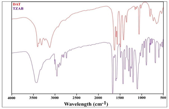 Because of the -OH stretching of the new hindered phenolic group, a wide absorption band developed at 3430 cm−1. An absorption at 1428 cm−1 was seen for C-H bending, whereas the classic asymmetric C-H stretching peaks emerged at 2968 cm−1. In the novel synthesized material TZAB, the -N-H stretching (primary amine group) absorption bands at 3400 and 3100 cm−1 disappeared, while the -C=N stretching (imine) exocyclic double bond peak formed at 1661 cm−1 [39]. It was confirmed that the intermediate TZAB had the correct structure by observing the absorption band at 1093 cm−1 due to the C-N stretching vibration as well as other characteristic peaks, as presented in Scheme 1.