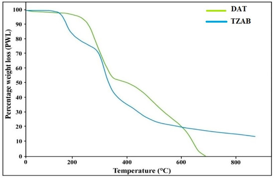 TGA curve of 3,5-diaminotriazole (DAT) and triazole Schiff base (TZAB).