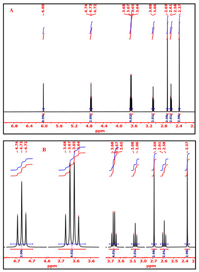 The major (δ ppm) assignments were performed at six ppm, which corresponds to the more deshielded -NH group protons. It was noted that the assignment of the -OH protons (δ = 4.73 ppm) was also deshielded, although less than the assignment of the -NH protons (δ = 6 ppm). The twin assignments of the methylene-group protons were detected at chemical shifts of 3.07 and 3.66 ppm, but the methyl group protons appeared to be significantly shielded compared to the methylene protons at 2.69 ppm. The characterization of the TZAB derv. ligand that occurred by using 1H-NMR spectroscopy is presented in Figure 3A,B.