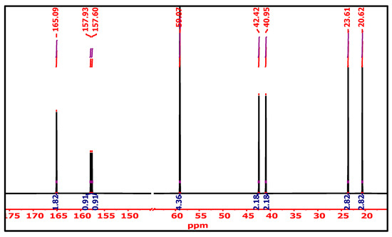 13C-NMR (100.01 MHz, DMSO-d6, 25 °C, TMS) δ, ppm: 20.6–23.6 (s, J = 4.1 Hz, -CH3), 59.1 (s, J = 2.2 Hz, -CH2-OH), 40.9–42.4 (s, J = 4.1 Hz, -CH2-CH2-OH), 165.1 (s, J = 5.2 Hz, -CH=N-), 157.9 (s, J = 0.6 Hz, -NH-C=N- of triazole ring). A 13C-NMR analysis associated with the energy of 100.01 MHZ and DMSO-d6 as a dilution agent is a dynamic tool which provides important data about the quantity of the carbon atoms in the synthesized ligand. The chief δ (ppm) performed about 20.6–23.6 ppm, which is associated with the more shielded methyl carbon. It was noticed that the methylene carbon attached to the hydroxyl group was further deshielded (59.1 ppm) than the next methylene carbon (40.9–42.4 ppm). The distinct assignment of the imine group carbon indicated that it was additionally deshielded and associated with a chemical shift of 165.1 ppm. The imine carbon of the triazole ring was established and gave a deshielded value of 157.9 ppm. The specification of the TZAB ligand by using 13C-NMR is shown in Figure 4.