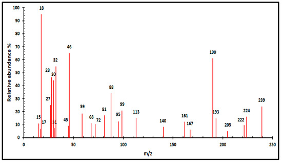 GC/MS (EI, 30 eV), m/z (% rel): [m/e]+ of 239, 88, 99, 18, 32, 46, 15, 30, 27, and 28. Anal. Calc. for C10H17N5O2 (239.28 g/mol): C, 50.20; H, 7.16; N, 29.27; O, 13.37. Found: C, 50.18; H, 7.15; N, 29.25; O, 13.39. Gas chromatography associated with a Mass Spectrometer (GC/MS) is another important and strong technique used to determine different parameters, namely, the chemical formula, more stable fragment [m/z]+, and purity. Figure 5 shows a GC/MS analysis of the triazole derv. Specific patterns of significant fragmentation were observed and were related to the synthetically produced TZAB derv. chelating ligand; for example, C4H8O2 with a molecular weight (M.W) of 88 and a relative abundance of 34, which would be associated with 4-hydroxybutan-2-one, and C2H5N5 with a M.W of 99 and a relative frequency of 21, which is connected to 1,2,4-triazole-3,5-diamine moiety.