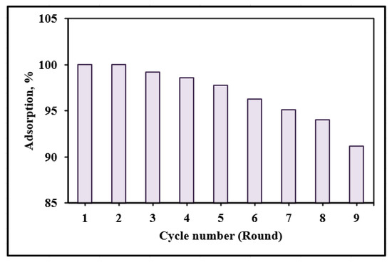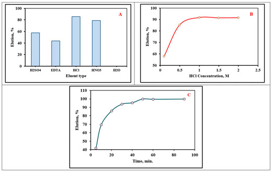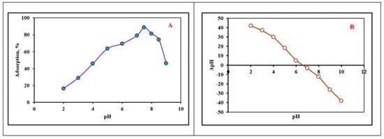 The pH variation is a significant factor in the adsorption process because of the hydrogen (H+) and hydroxyl (OH−) ions. This component can ensure the separation of the presented metal ions such as Co2+ and alter the surface chemistry of the chosen sorbent. Figure 6A illustrates the effect of the pH change on the Co2+ adsorption efficiency. The pH effect was investigated by varying it in the range from 2 to 10 for a Co2+ concentration of 250 mg/L.