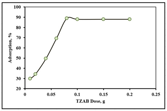 The dosage of the sorbent has a significant effect on the practical application of the sorbent for the metal ion adsorption process [40,41]. The effect of the adsorbent dose on the Co+2 adsorption process was examined by employing variable amounts of the TZAB ranging from 0.01 to 1 g, which were added to 20 mL of the Co+2 solution with a 250 ppm concentration at an ambient temperature (25 °C), 7.5 pH, and contact time of 1 hr. The results obtained are presented in Figure 7. It was noted that the percent removal of Co+2 improved from 29.76 to 88.93% when the sorbent dose increased from 0.01 to 0.08 g. This can be attributed to the fact that the increase in the TZAB dose resulted in more active sites that were available for sorption at the same concentration of Co+2, so at 0.08 g of the TZAB, all the active sites were occupied and any excess TZAB dose addition did not affect the adsorption capability of the TZAB, as presented in Figure 7.