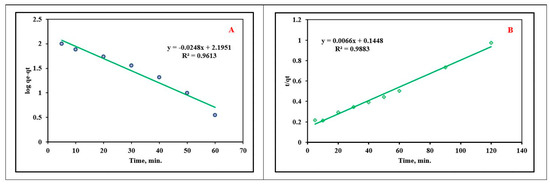 It was noted that the TZAB adsorption process clearly fit the pseudo second-order kinetic model (R2 = 0.9983) more faithfully than that of the pseudo first-order kinetic equation (R2 = 0.9613), as presented in Table 1 and Figure 9, which suggests that the TZAB adsorption of Co+2 may depend mainly on the chemisorption process [43,44]. In the meantime, it can be concluded that the TZAB had a large number of active sites for the absorption of Co+2.