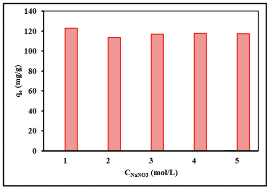 The influence of the ionic strength on the cobalt adsorption behaviour can be utilized to differentiate the sort or type of complex formation between the sorbent and adsorbate surface. If the ionic strength has no effect on the sorption process, the adsorbent and adsorbate will form an inner surface complex. If the ionic strength increases, the adsorbent and adsorbate will construct an outer surface complex. The adsorption experiment was conducted with various NaNO3 concentrations (≈0, 0.001, 0.01, 0.1, and 1 mol/L). It was noted that the TZAB adsorption capacity to adsorb Co+2 was not sensitive to changes in the NaNO3 concentration, as shown in Figure 10. The sorption procedure of the manufactured sample was independent of ionic strength, and complexation on the inner spherical surface (chemical adsorption) instead of the outer spherical surface (physical adsorption) had a larger effect on the sorption of Co+2 on the TZAB [45]. The kinetic effect of the adsorption was evidenced by the experimental results. In conclusion, the TZAB adsorption followed the pseudo second-order model, which is controlled by chemical adsorption.