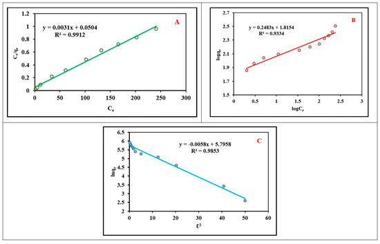 (A) Langmuir isotherm model, (B) Freundlich isotherm model, (C) Dubinin–Radushkevich model applied to determine Co+2 ions sorption by TZAB.