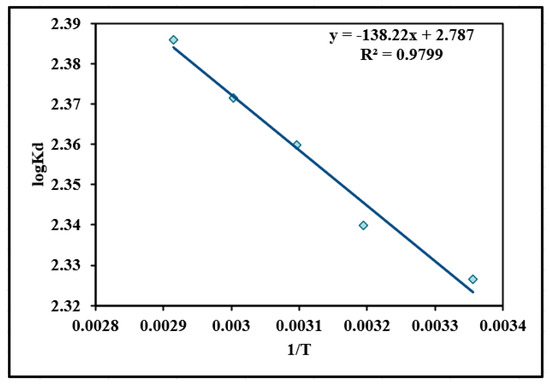 The effect of temperature on Co+2 ions sorption when using the TZAB adsorbent was studied at 0.08 g of TZAB that was added to 1500 ppm of Co+2 at pH 7.5 with a 90 min contact time in the temperature range from 25 °C to 70 °C. The obtained results are presented in Figure 13, which demonstrate that increasing the temperature led to a reduction in the uptake capacity of Co+2 by the TZAB adsorbent, indicating that temperature had a positive influence on the sorption of Co+2 ions by the TZAB and that the uptake was an endothermic process.