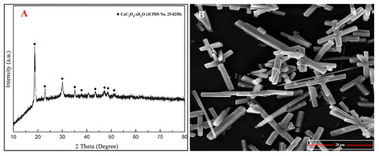 (A) XRD analysis and (B) SEM of the solid precipitation of cobaltous oxalate CoC2O4.
