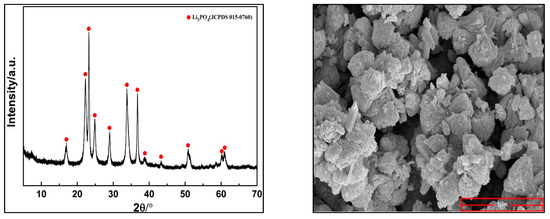 The XRD analysis of the white precipitate of lithium phosphate shows that the diffraction lines of the precipitated solid corresponded to Li3PO4 (JCPDS 015-0760), while the SEM analysis showed that lithium phosphate particles had an olivine structure with a diagonal length between 1 and 2 μm [42].