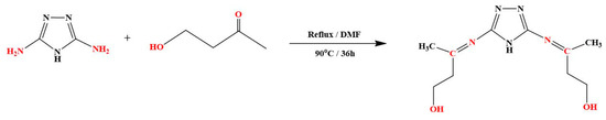 In order to prepare the adsorbent, 2.0 g of 3,5-diamino-1,2,4-triazole corresponding to (10.0 mmol), in addition to 9.90 g 4-hydroxy 2-butanone corresponding to (20.0 mmol), were mixed by using a three-neck round bottom flask (250 mL has 3 arms) sited on a hot plate with a stirrer associated with a condenser and temperature controller. A total of 25 mL of di-methylformamide (DMF) was utilized as the solvent of the reaction. The reaction mix was refluxed for 36 h at 90 °C, as presented in Scheme 1. After the completion of the reaction, the remaining solvent was evaporated by using an evaporator. To eliminate all traces of the solvent, the resultant pale-yellow product was dried at 50 °C for 6 h by using a vacuum oven before being measured. It was noted that the final yield was 10.7 g, which represents about 92.68%. This chemical is microcrystalline solid in nature, has a 280 °C melting point, and is pale yellow in color. At room temperature, this ligand was soluble in DMF and DMSO.