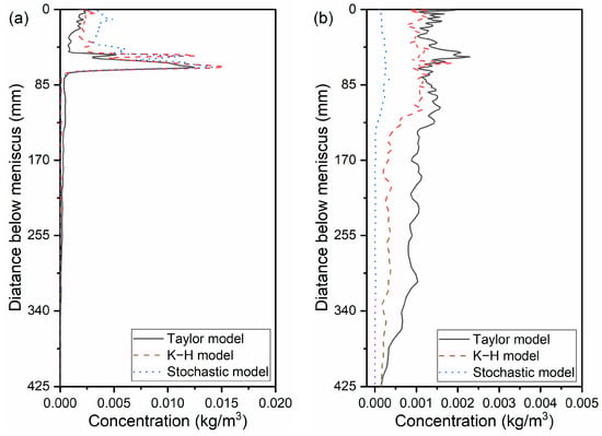 The effect of the bubble-breakup model on the average bubble concentration at 170 mm below the meniscus was compared in Figure 6. The bubble concentration with the Taylor model was significantly higher than that with the K-H model and Stochastic model. The bubble concentration was close to zero in the Stochastic model. The bubble concentration increased gradually from the mold center to the narrow face at the lower part of the mold. Because of the small buoyance of fine bubbles, they were more likely to move with the molten steel. Thus, the number of fine bubbles was higher near the narrow face at the deep part of the CC mold. The bubble concentration decreased from the SEN to the narrow face at the upper part of the mold due to the rise of the large bubbles. Figure 7 analyses the mass concentration of air bubbles along the casting direction quantitatively in more detail. From the Taylor model to the K-H model to the Stochastic model, the mass concentration of air bubbles in the vicinity of the SEN steadily rose. The average bubble concentration did, however, steadily decline close to the 1/4 mold width and narrow face. The biggest bubble concentration was found close to the SEN, and it was almost ten times closer to the narrow face.