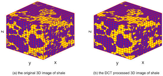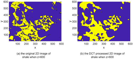 Figure 3 and Figure 4 showcase the shale sample, which contains voxels with a resolution of 5 nm. Shale with nanoscale porosity is the focus of this study. Figure 3 shows a comparison between the original 3D image of shale and the DCT-processed 3D image of shale. The DCT-processed image appears smoother and more uniform, with less variation in intensity between different regions of the image. Figure 4 shows a comparison between the original 2D image slice of shale at a specific depth (z = 600) and the DCT-processed 2D image slice at the same depth. Again, the DCT-processed image appears smoother and more uniform. Moreover, the main pore structure characteristics of shale are still preserved after DCT processing.